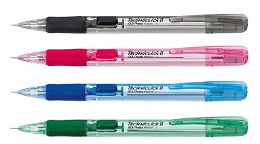 水晶般透明杆,压力要轻,推进铅芯时不必变换握笔的位置,手指形状的橡胶所致笔处使数小时写后都倍感舒适。使用0.5mm替换铅芯和PDE-1固定笔擦。3.5mm固定笔盖。共4色。